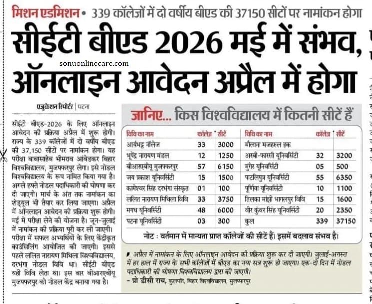 Babasaheb Bhimrao Ambedkar Bihar University (BRABU)Bihar CET B.Ed Admission 2026-2028Bihar B.Ed Entrance Exam 2026www.sonuonlinecare.com |