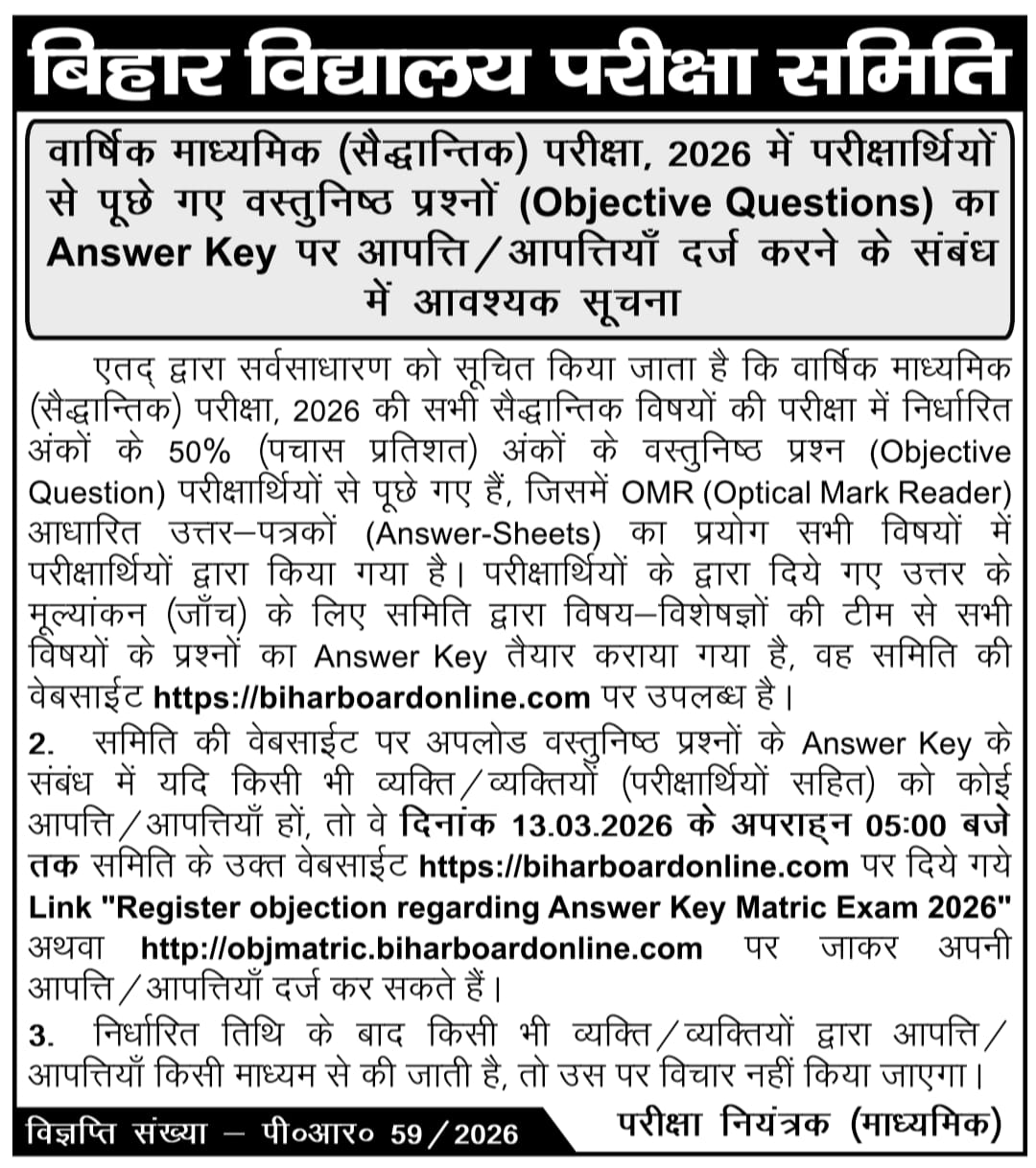• Exam Name : Bihar School Examination Board Patna Class 10th Annual Exam 2026