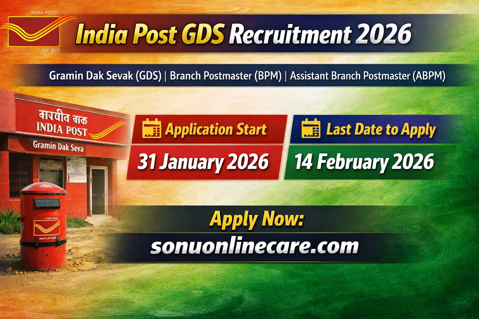 India Post GDS Recruitment 2026 India Post has started the Gramin Dak Sevak (GDS) Recruitment 2026 to fill jobs like Gramin Dak Sevak (GDS), Branch Postmaster (BPM) and Assistant Branch Postmaster (ABPM) across the country. Read the official notification for India Post GDS Vacancy 2026, Eligibility, Subject Details information, Document Required, Age limit, How to Apply and all other information. India Post GDS Recruitment 2026 has started from 31 January 2026 and the candidates can apply Before 14 February 2026.