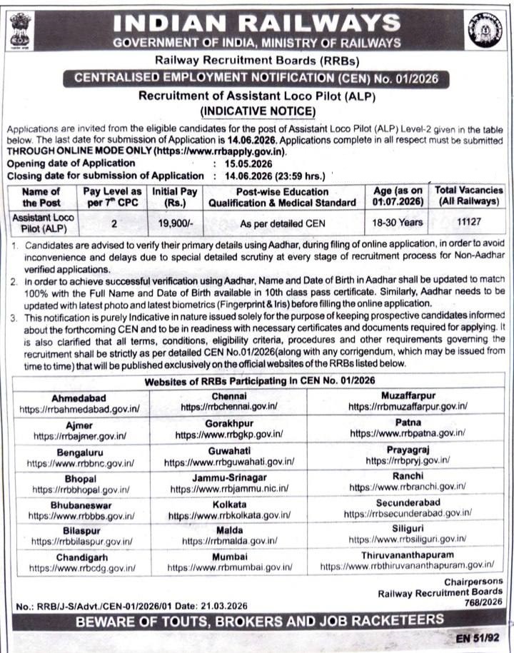 The Railway Recruitment Board (RRBs) has released the RRB ALP Recruitment 2026 indicative notification for the post of Assistant Loco Pilot (ALP) under CEN No.-01/2026. This recruitment drive is conducted by Indian Railways to fill a large number of vacancies across various railway zones in the country.Candidates who are interested in railway jobs can apply online through the official application portal once the registration process begins.According to the official notification, the online application process will start on 15 May 2026 and will continue until 14 June 2026. Candidates are advised to complete their applications before the last date to avoid any technical issues.A total of 11,127 vacancies have been announced for the Assistant Loco Pilot (ALP) post under this recruitment drive. These vacancies will be distributed across different railway zones in India.