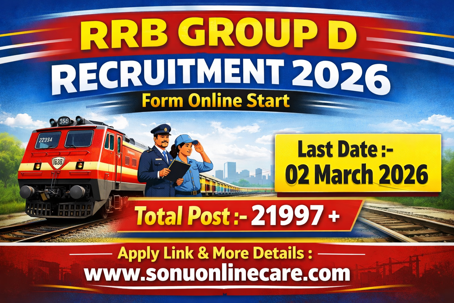 RRB Group D Recruitment 2026 recruitment is expected to be released with 21997 vacancies for Level-1 posts in Indian Railways. This is a great opportunity for 10th pass and ITI candidates to get a stable government job with a starting pay of ₹ 18,000 + allowances. Selection will be through CBT, PET, Document Verification, and Medical Test. Online applications will be invited through the official RRB website.you can chek all criteria on RRB official website. RRB Group D Recruitment 2026 recruitment Apply Online Form Between 31January 2026 to 02 March 2026. |