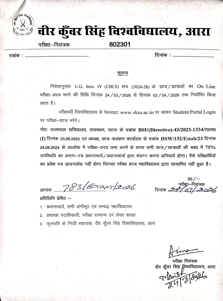VKSU Ara UG Semester-4 Exam Form 2024-28 –Veer Kunwar Singh University (VKSU), Ara has officially released the CBCS Graduation Semester-4 Exam Form  for the academic session 2024–2028. Students who are enrolled in B.A., B.Sc. and B.Com appeared in the VKSU Ara UG Semester-4 Examination can now Apply Exam Form online through the university’s official examination portal.
