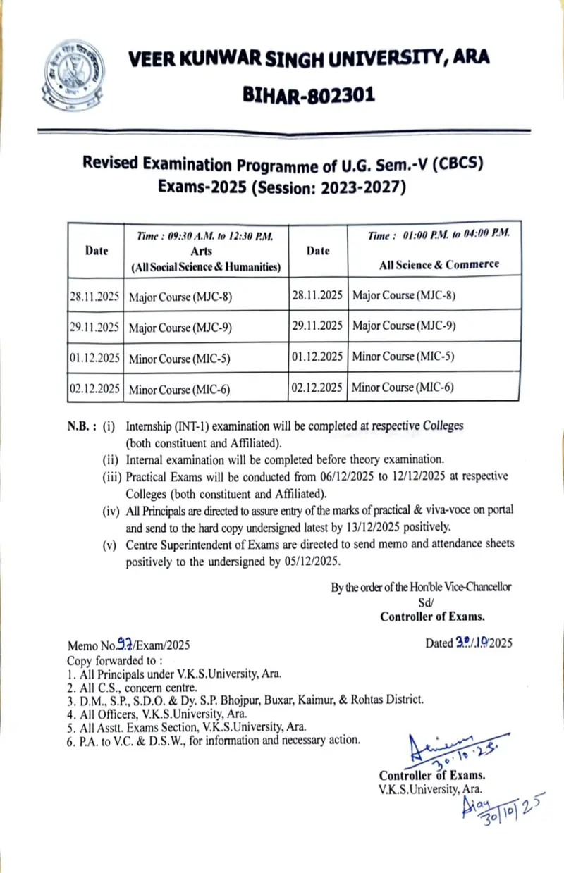 VKSU Ara UG Semester-5 Result 2023-27-वीर कुंवर सिंह विश्वविद्यालय (वीकेएसयू), आरा ने शैक्षणिक सत्र 2023-2027 के लिए सीबीसीएस स्नातक सेमेस्टर-5 का परिणाम आधिकारिक तौर पर जारी कर दिया है।बी.ए, बी.एससी. और बी.कॉम पाठ्यक्रमों में नामांकित और सेमेस्टर-5 की परीक्षा में शामिल हुए छात्र अब विश्वविद्यालय के आधिकारिक परीक्षा पोर्टल के माध्यम से अपना परिणाम ऑनलाइन देख सकते हैं। VKSU Ara UG Semester 5 Result 2023-27 –Veer Kunwar Singh University (VKSU), Ara has officially released the CBCS Graduation Semester-5 Result for the academic session 2023–2027. Students who are enrolled in B.A B.Sc. and B.Com courses and appeared in the VKSU Ara UG Semester-5 Result 2023-27 examination can now check their results online through the university’s official examination portal. |