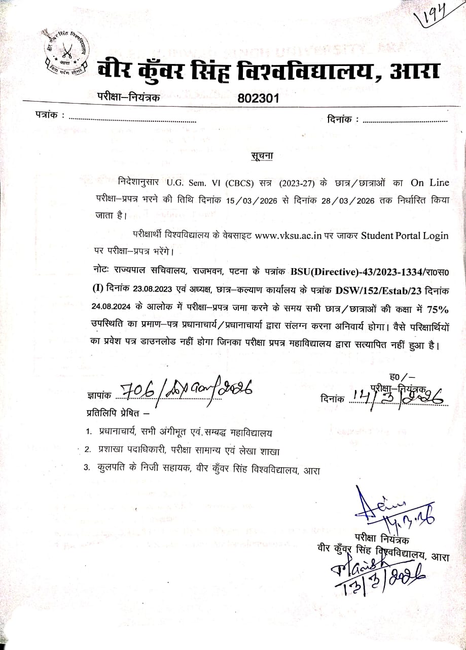 VKSU Ara UG Semester-6 Exam Form 2023-2027 Veer Kunwar Singh University (VKSU), Ara has officially released the CBCS Graduation Semester-6 Exam Form Start for Academic session 2023–2027.